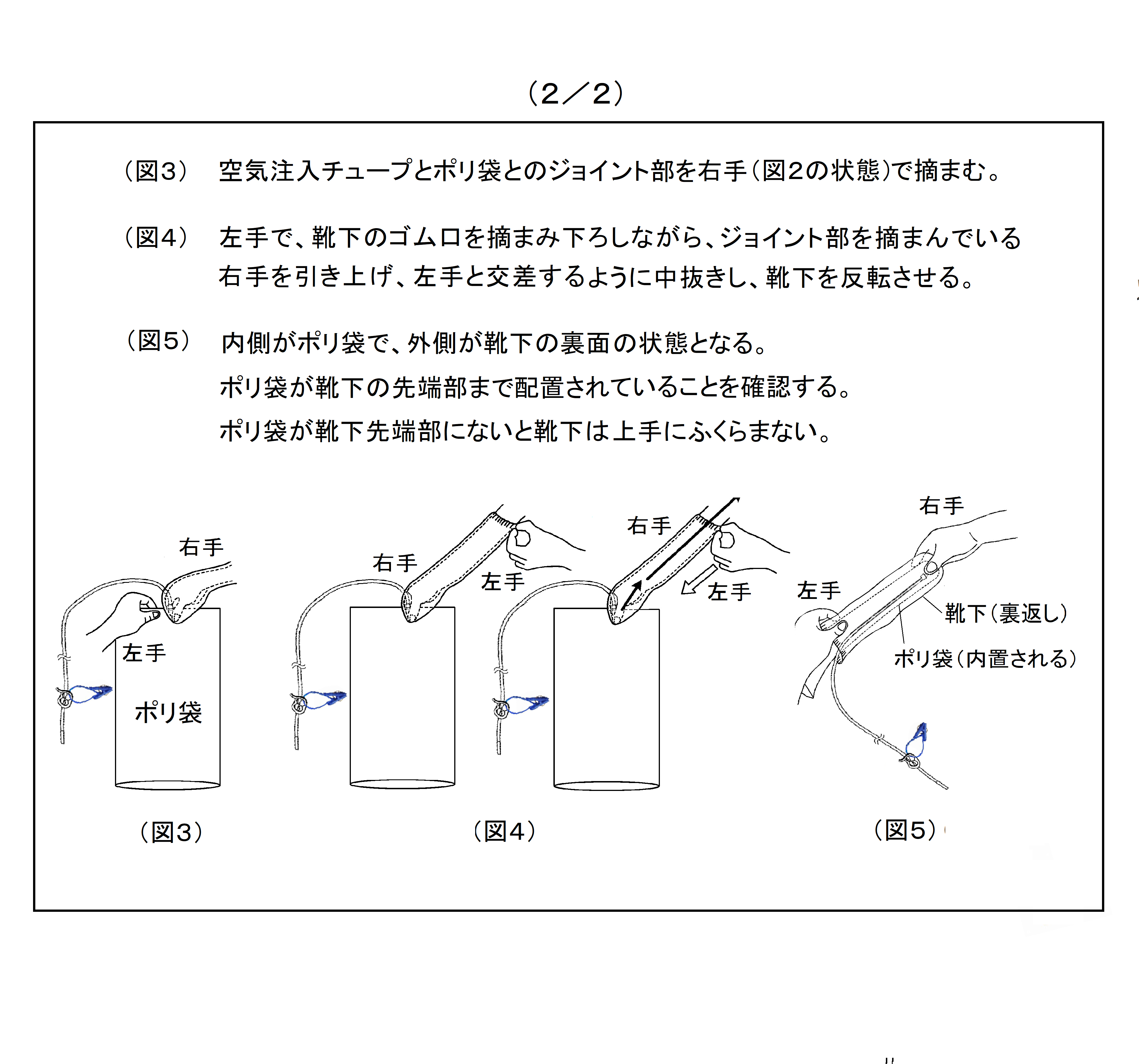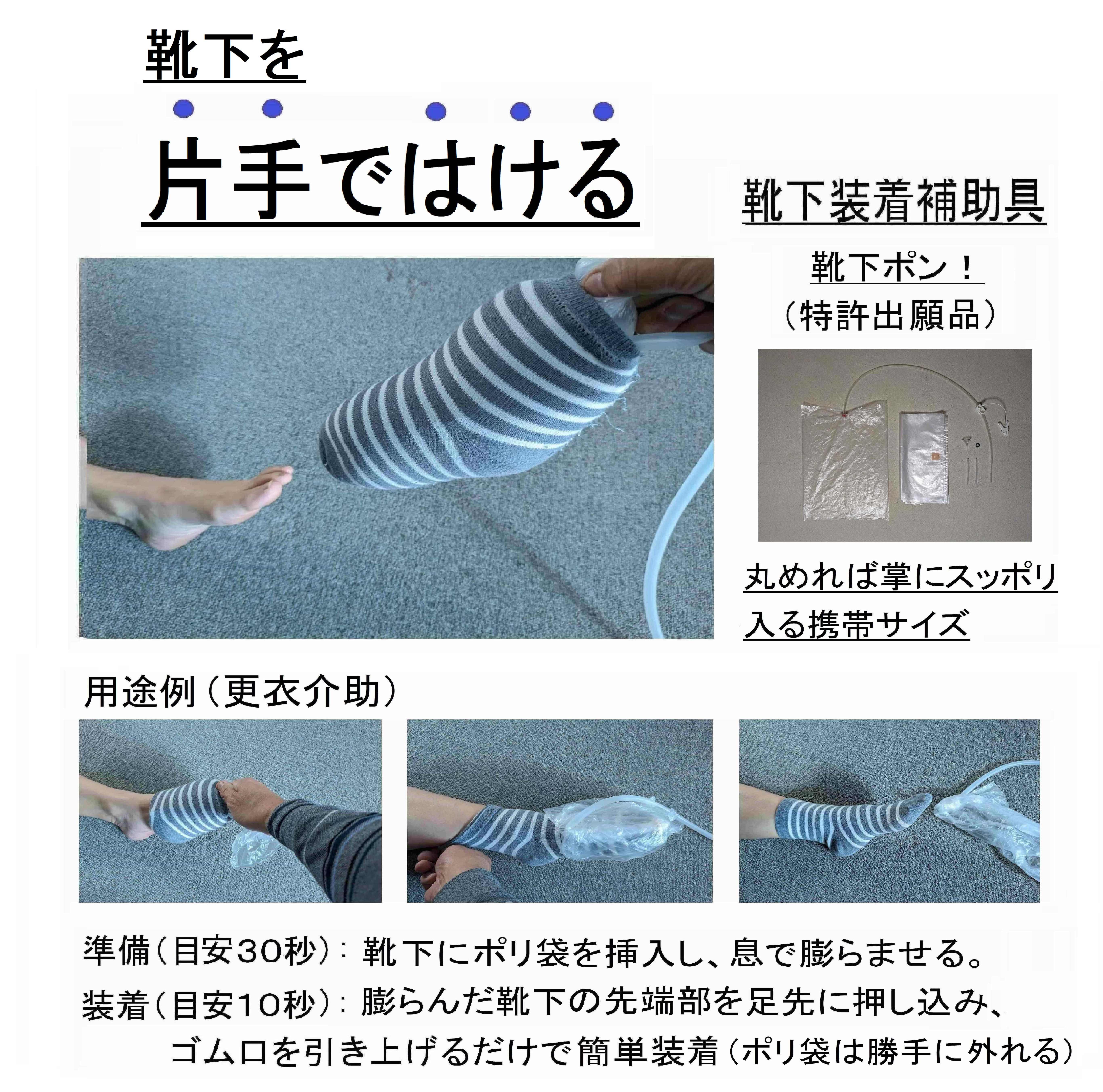 この方法で靴下を履くことのメリットは、足指の爪の形状に関係なく(巻き爪、割れ爪、バンドエイドや包帯を巻いた足爪、その他外反母趾など)爪や指が靴下に引っ掛からずに履けるという点です。特に更衣介助においては、靴下が爪先に引っ掛からずに履かせることが出来るため、介助をされる側にとっても、する側にとっても優しい靴下履きの作業が可能です。また、片手で装着が可能なため、足腰を曲げたり、両手を伸ばしたりすことが不自由に感じる方の自助具としても役立ちます。