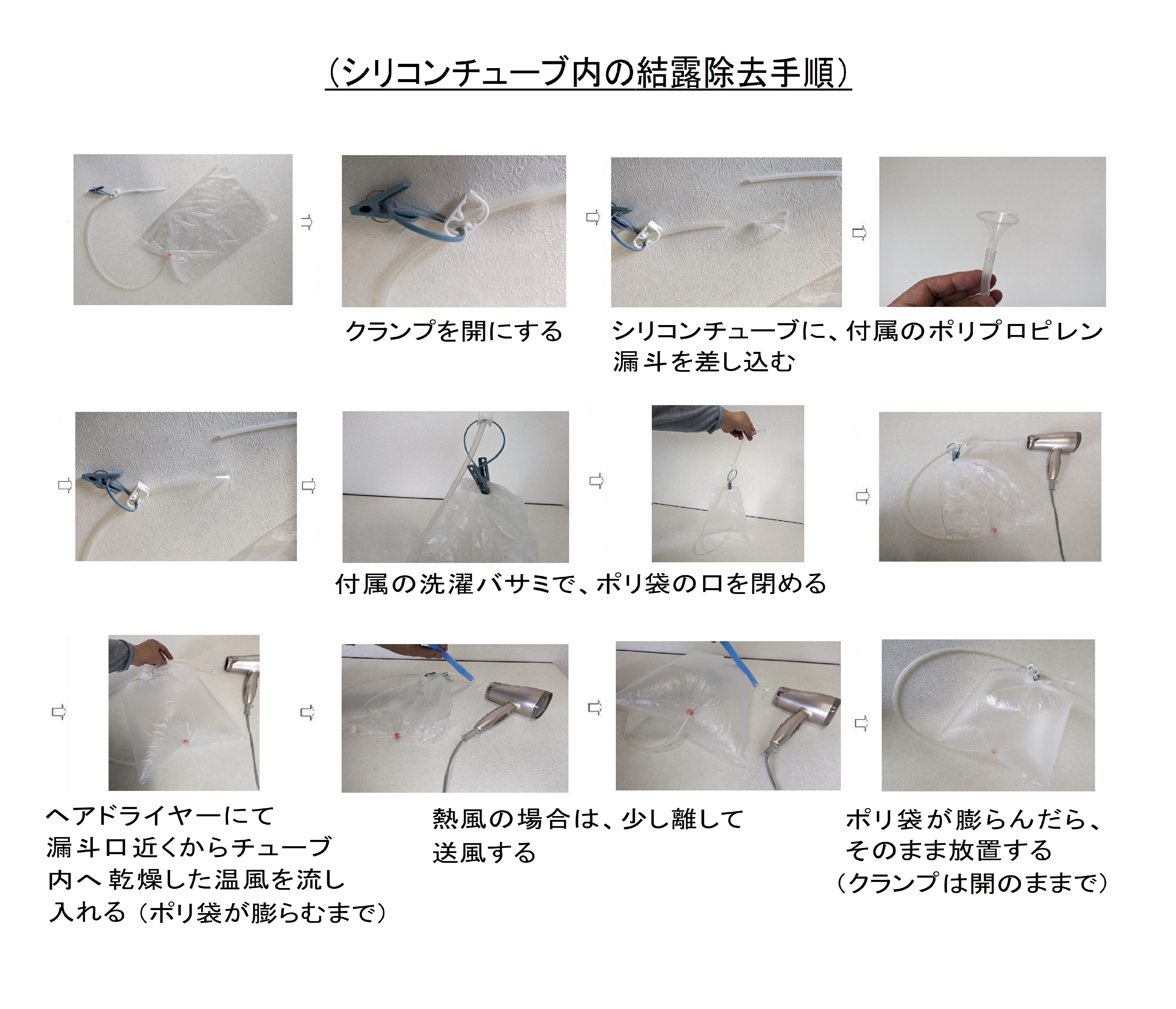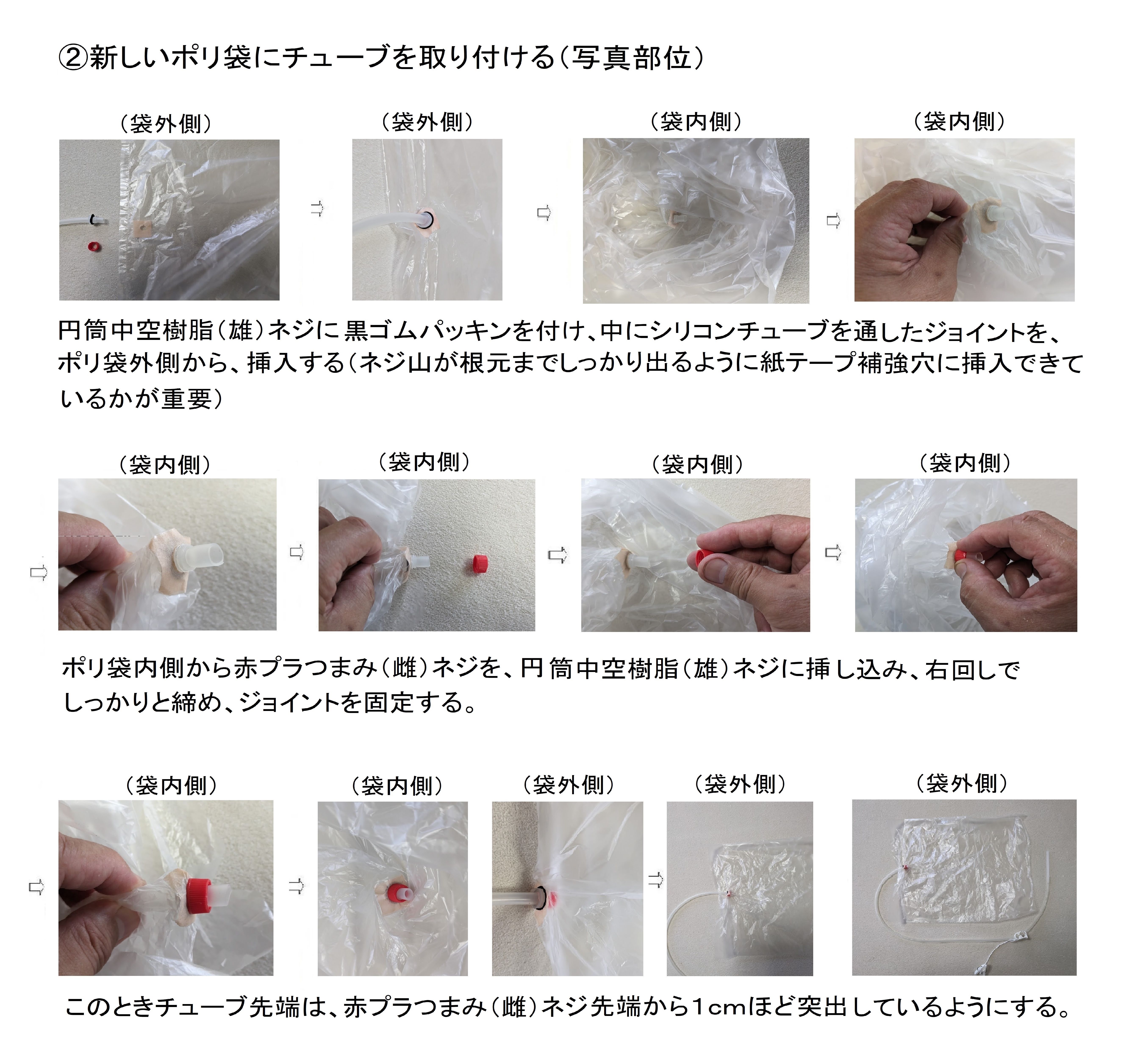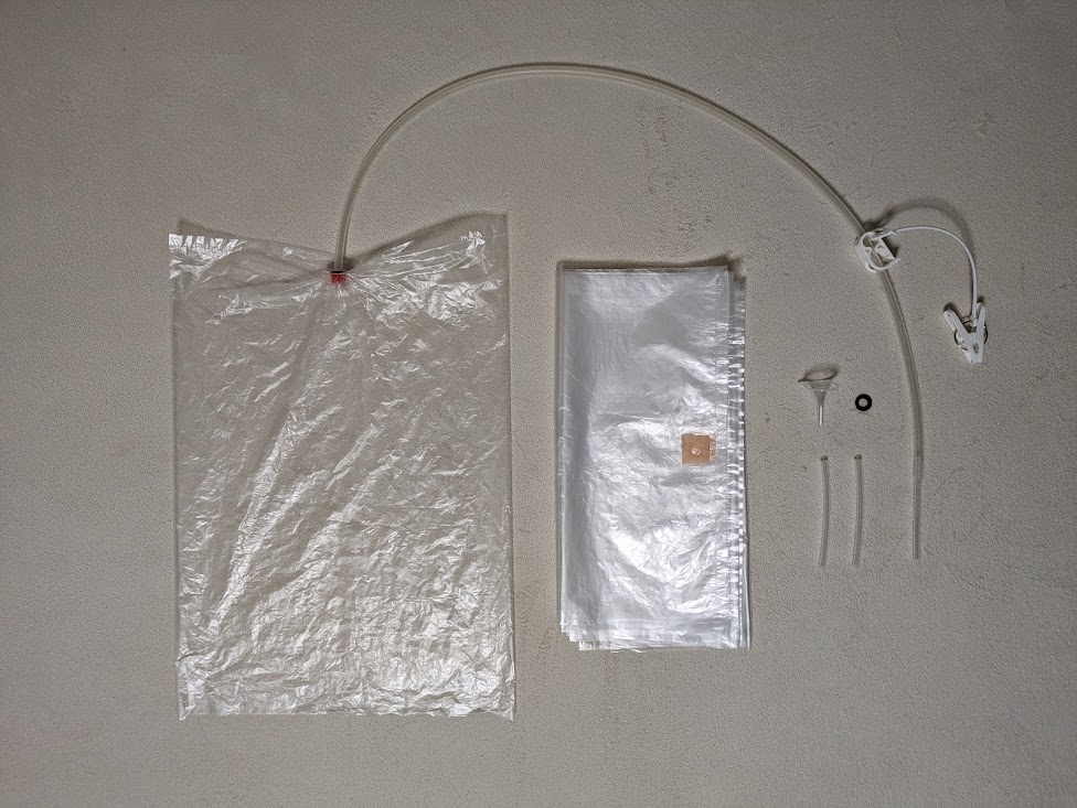 商品内訳(mm): 空気注入具1セット(シリコンチューブ1200、クランプ、ジョイント、洗濯バサミ、吹き口チューブ100、高密度ポリエチレン袋各1P)、交換用高密度ポリエチレン袋(340x480x0.01/9φ穴開き9枚)、交換用吹き口チューブ100 2本、ポリプロピレン漏斗φ30×40 1個、ゴムパッキン1枚、使用説明書 1冊 |